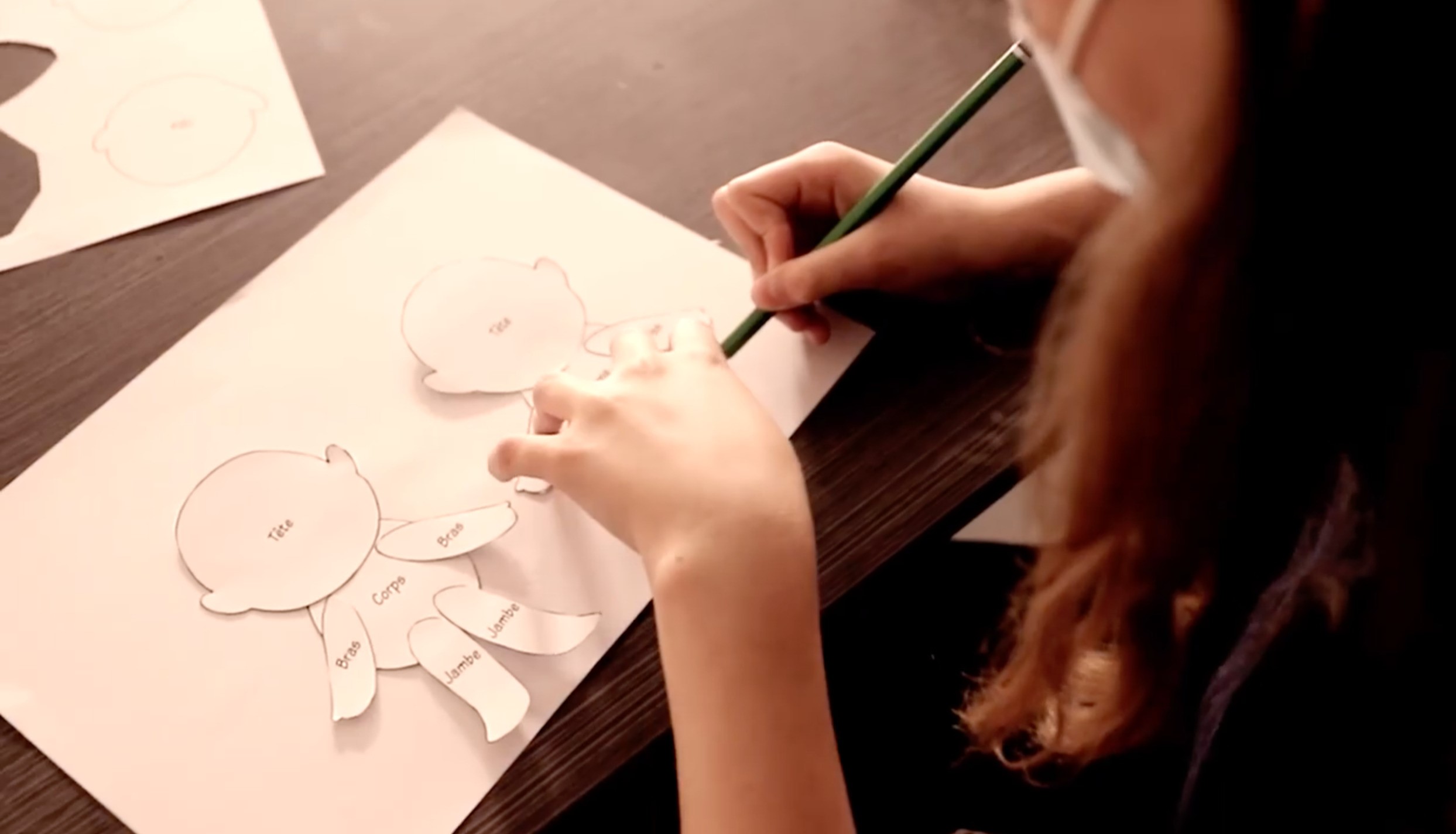 Sur une feuille distribuée, les enfants découpent un corps pré-dessiné, des membres et quatre têtes pour un personnage. Chacun choisit la position des jambes et des bras, les colle au corps, puis colle une tête. Le pantin ainsi créé sert de base pour dessiner le contour d’un personnage au crayon. Les enfants peuvent échanger leurs pantins pour obtenir des dessins de personnages dans différentes positions. Les trois têtes restantes servent à dessiner différentes expressions, à réinventer à l’infini !