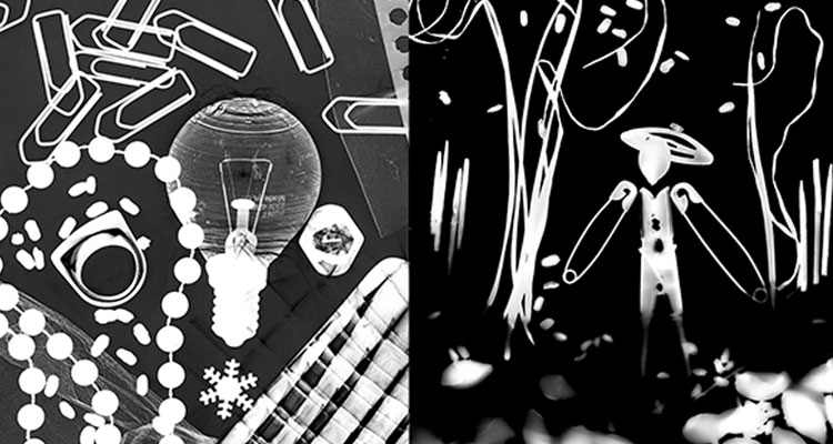 Réalisation de photogrammes (tirages argentiques en laboratoire photographique) à partir d’éléments qui nous entourent, manufacturés ou organiques. Ce qui était caché dans la lumière, nous est révélé dans le noir!