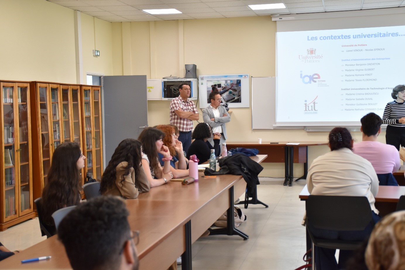 Pour l’occasion, le CEPE a eu l’honneur de recevoir M. Benjamin DREVETON, directeur de l’IAE de Poitiers, qui a fait le déplacement pour adresser un message de bienvenue aux étudiants. Il était accompagné de Mme Virginie GUIBERT, responsable administrative, ainsi que d’autres membres du personnel administratif. Les étudiants ont également eu le plaisir d’écouter Mme Nathalie COSNARD, infirmière à Angoulême – Service de Santé Universitaire, qui a présenté les services du SSU.