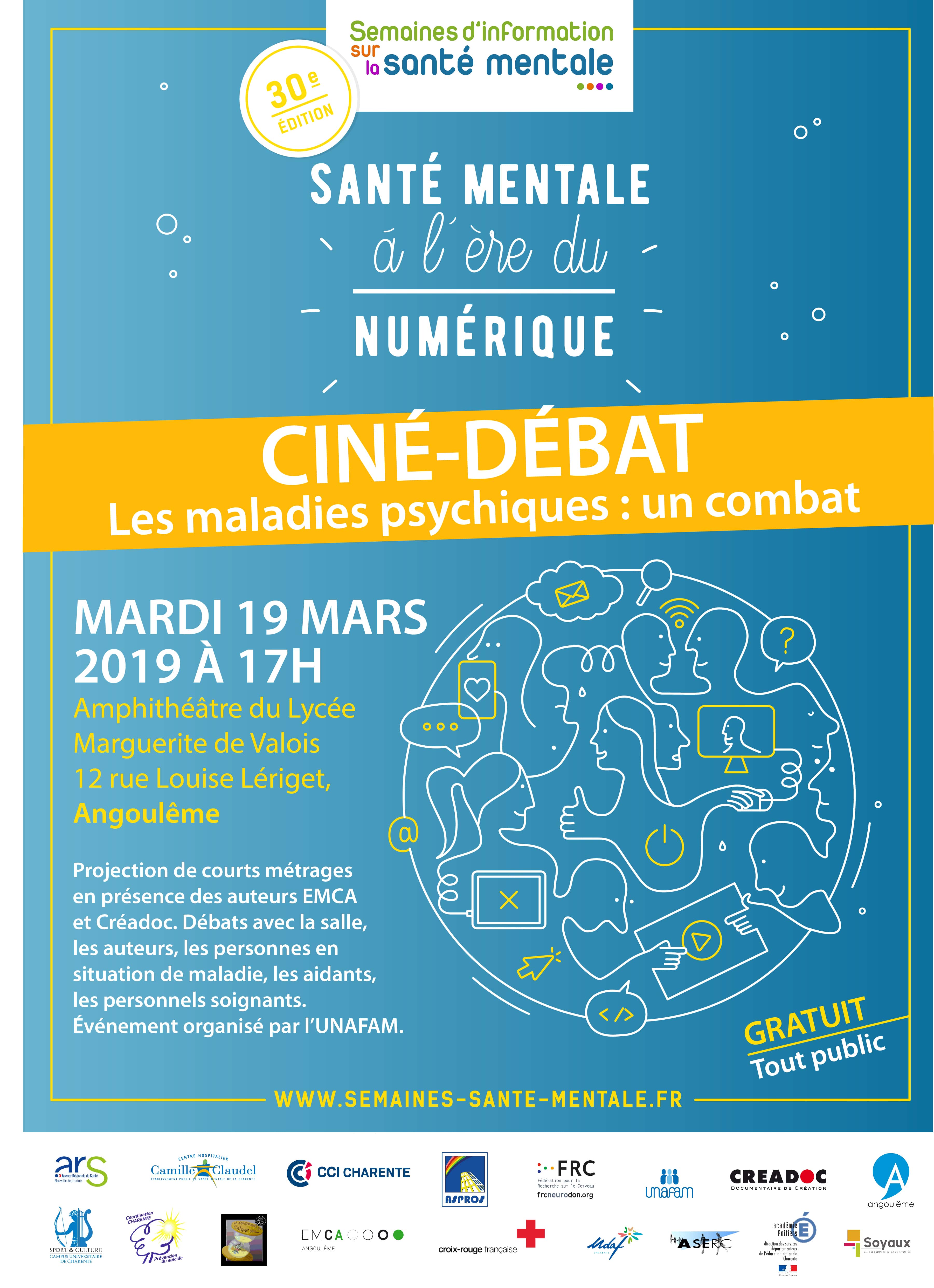 L’association UNAFAM 16, en collaboration avec le Centre Hospitalier Camille Claudel, organise une manifestation “Ciné-débat – Les maladies psychiques : un combat » le 19 mars 2019 dans le cadre des Semaines d’Information sur la Santé Mentale dans l’amphithéâtre du Lycée Marguerite de Valois.