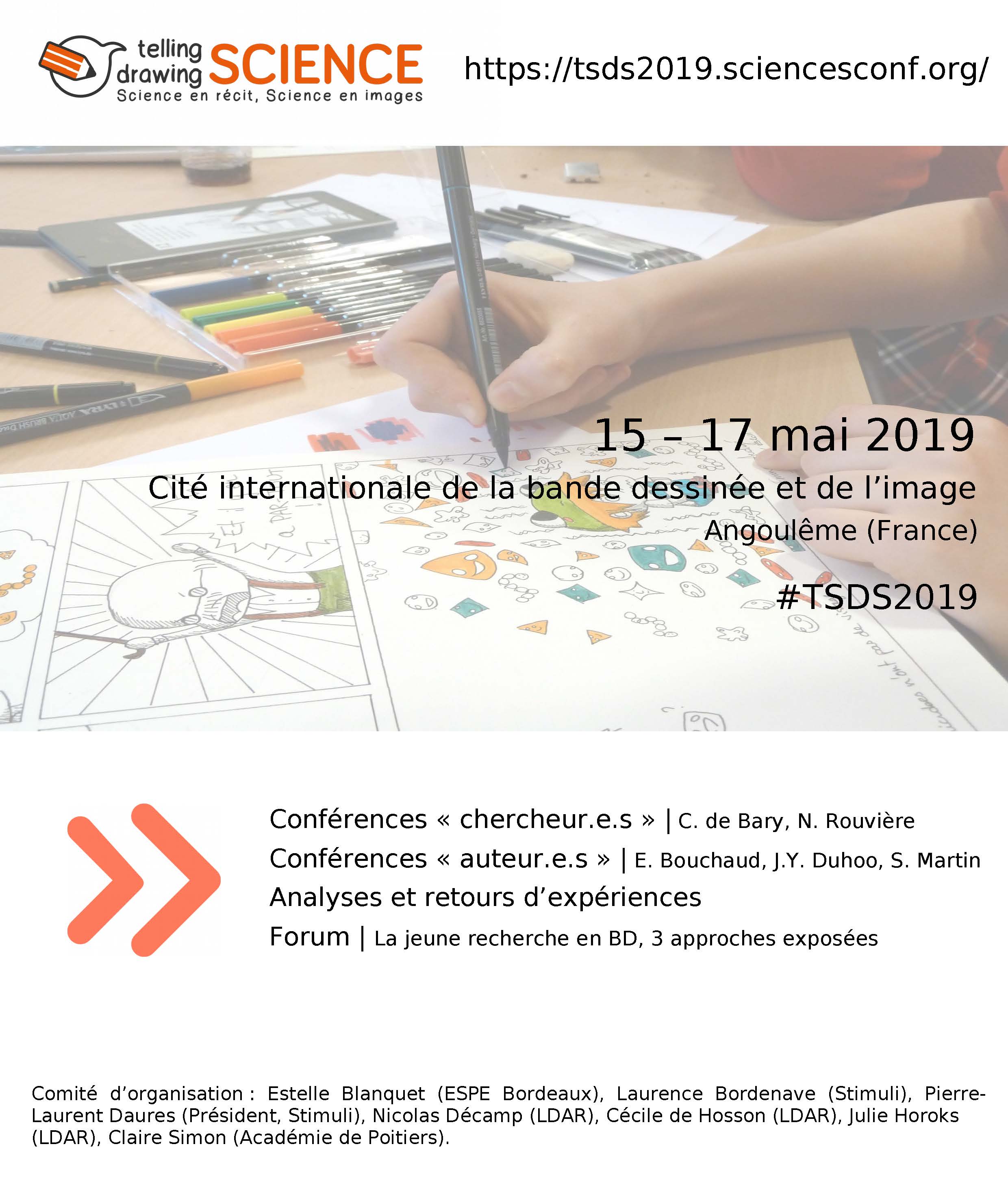 Le Laboratoire de Didactique André Revuz et l’association Stimuli organisent la deuxième édition du colloque international Telling Science, drawing Science TSDS#2 – Science en récit, Science en images, les 15, 16 et 17 mai 2019 à la Cité internationale de la bande dessinée et de l’image à Angoulême (France).
