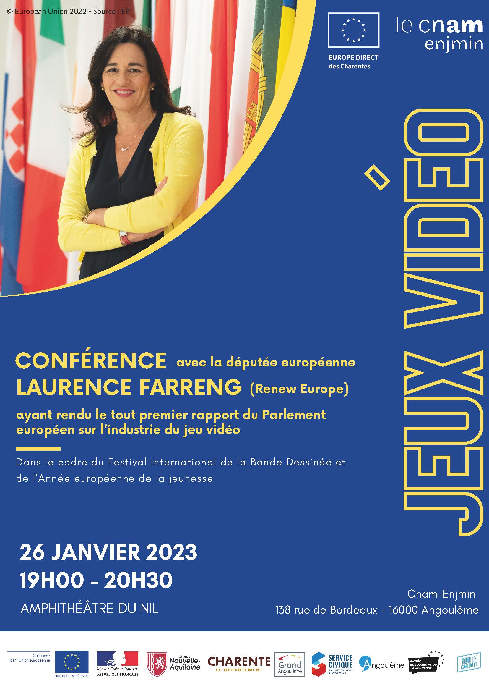 Une conférence avec Laurence FARRENG, député européenne ayant rendu le tout premier rapport du Parlement européen sur l’industrie du jeu vidéo, est organisée dans le cadre du Festival International de la Bande Dessinée et de l’Année européenne de la jeunesse.