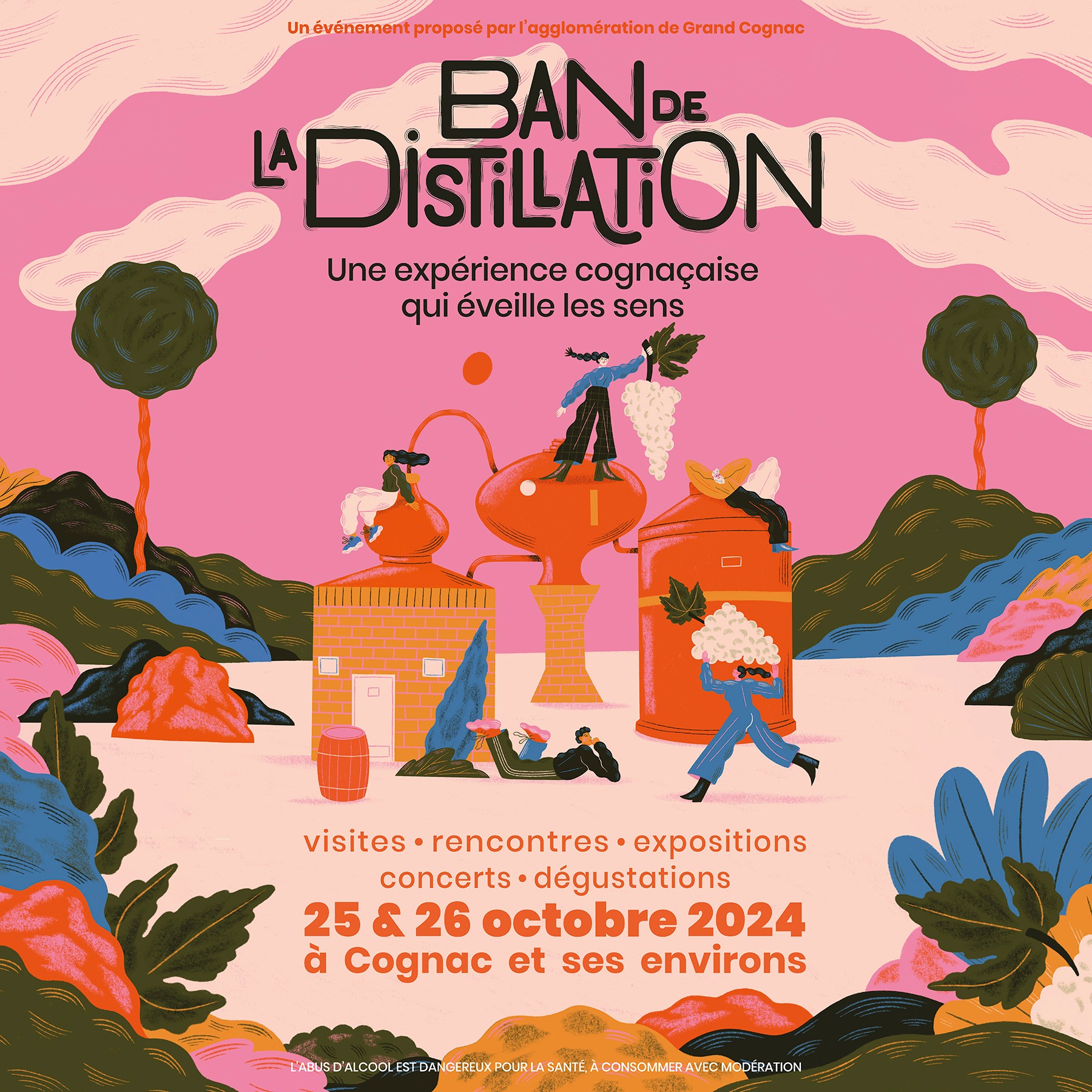 L’agglomération de Grand Cognac propose les 25 et 26 octobre 2024 la deuxième saison du Ban de la Distillation, une expérience cognaçaise qui éveille les sens. Pour élaborer le visuel de l’événement, elle a fait appel à une artiste de l’agence Fichtre Diantre de l’écosystème Magelis en la personne de Clara Dupré ou Clara Super Duper.