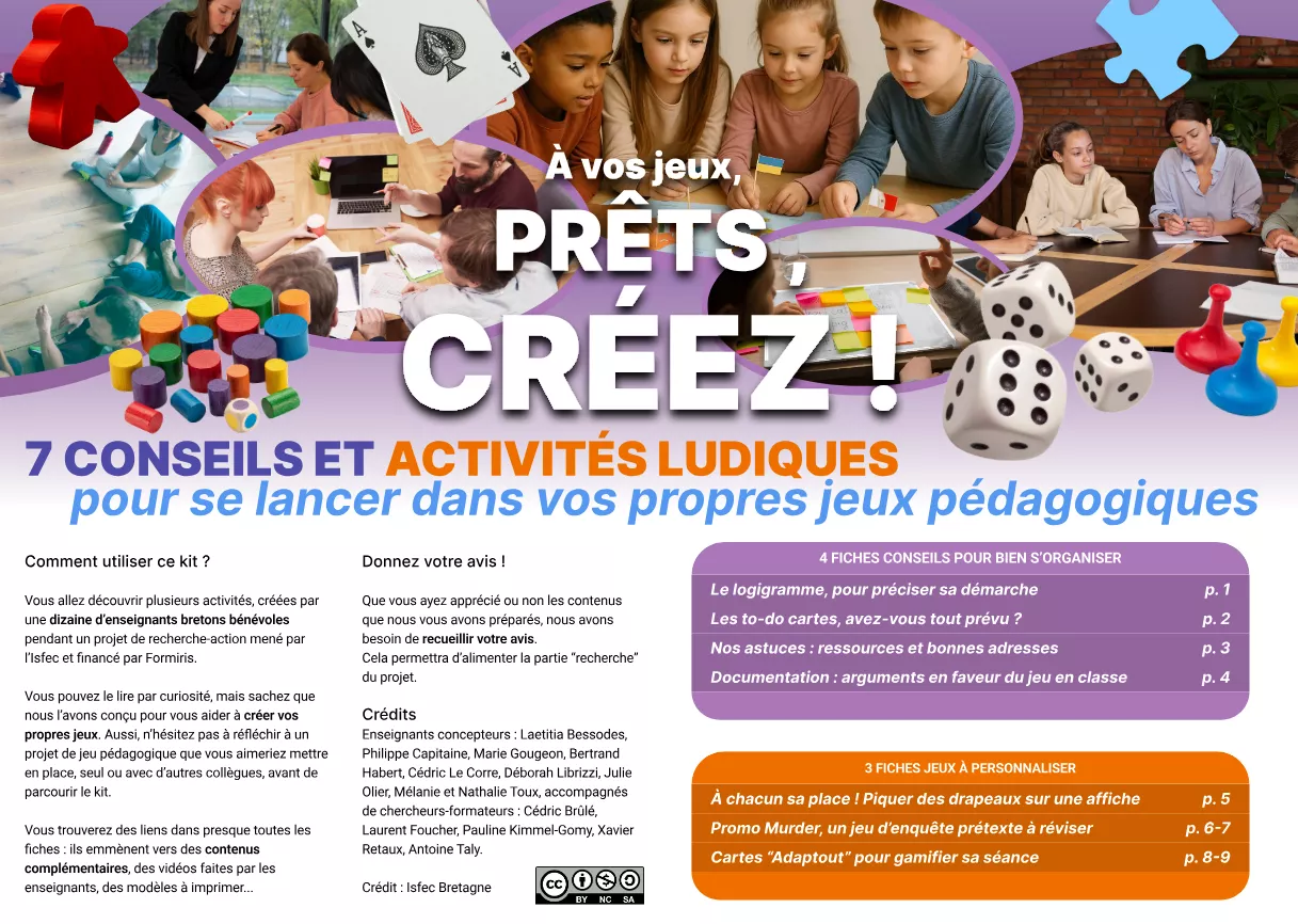 Au terme de cette aventure, la réalisation d’un kit de création et d’animation des jeux en classe. Disponible gratuitement, ce document, à mettre entre les mains de tous les enseignants, est l’aboutissement de 4 ans de travail. Au total, 12 professeurs de l’Isfec Bretagne ont découvert l’UX et le Game Design, au travers de game jams et de projets de création de jeux avec des rôles asynchrones, menés et testés sur leurs classes. Ils ont ensuite préparé des jeux pour leurs pairs, prêts à être utilisés, customisés ou encore détournés.
