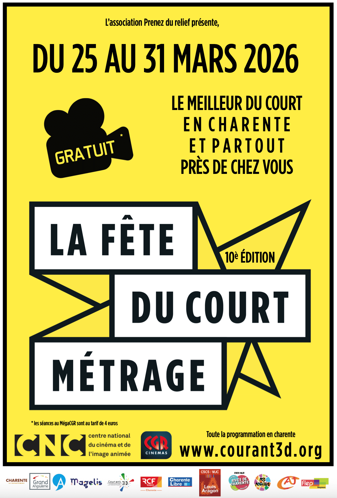 Du 25 au 31 mars, la fête du court métrage, partout près de chez vous le meilleur du cinéma court ! Au Méga CGR, à la MJC Louis Aragon à Ma Campagne, à la MJC Mosaïque, au FLEP, au CAJ et dans de nombreux établissements scolaires de Charente.