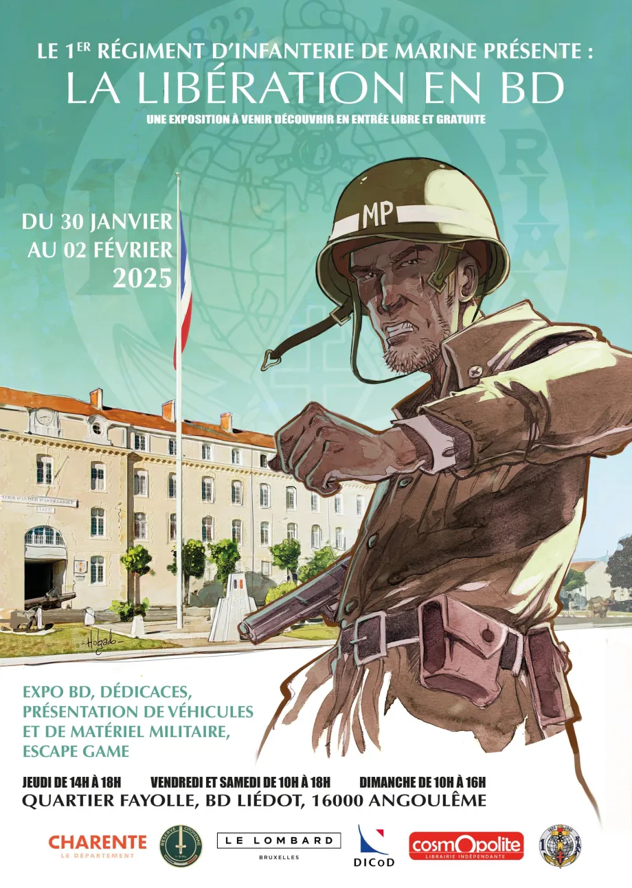 Accompagnant les 80 ans de la Libération et de la Victoire, le 1er RIMa ouvre ses portes autour d’une exposition consacrée à la Libération en BD du 30 janvier au 02 février 2025, en entrée libre et gratuite. Au travers d’un escape game, de séances de dédicaces, de présentation de matériel et véhicules militaires modernes comme anciens, le régiment d’Angoulême offrira aux visiteurs une expérience inédite et ludique au sein de ses murs, en présence de ses marsouins et de nombreux auteurs.