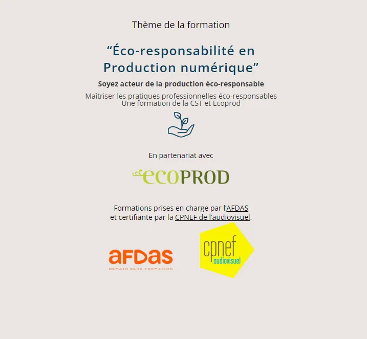 À l’occasion des RADI RAF 2023, la CPNEF de l’audiovisuel, représentée par sa Déléguée Générale, Ségolène Dupont, a homologué le regroupement composé de la CST (Commission supérieure technique de l’image et du son) et Ecoprod pour le nouveau parcours de formation certifiante spécialisé en production éco-responsable d’images numériques.