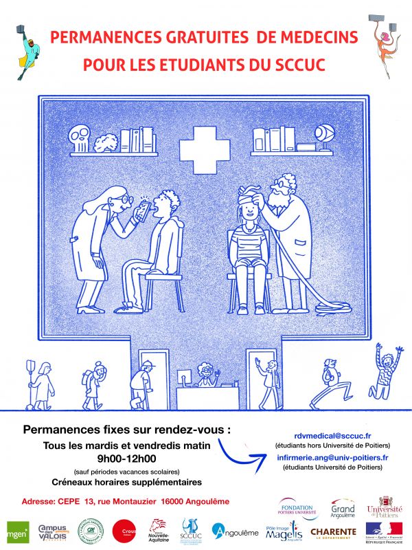 La permanence des médecins est un service à destination des étudiants du SCUUC* dépourvus de médecin traitant. La permanence a pour but de permettre aux étudiants une prise de rendez-vous rapide avec un médecin (médecin bénévole à la retraite) et ainsi bénéficier d’un accès gratuit aux soins.