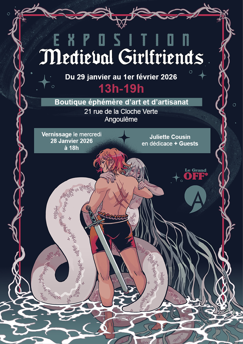À l’occasion du Grand OFF d’Angoulême, Juliette Cousin, un Talent d’Angoulême, vous présente une exposition mettant en avant une sélection d’une quinzaine de grands formats issus des pages de sa BD Medieval Girlfriends, imprimés en Digigraphie!