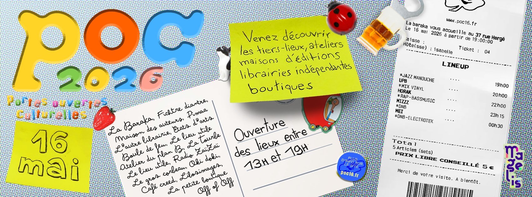 La Baraka, en partenariat avec Magelis et avec le soutien de la Ville d’Angoulême, propose la quatrième édition des Portes Ouvertes Culturelles (POC) d’Angoulême le samedi 16 mai 2026 à partir de 13h.