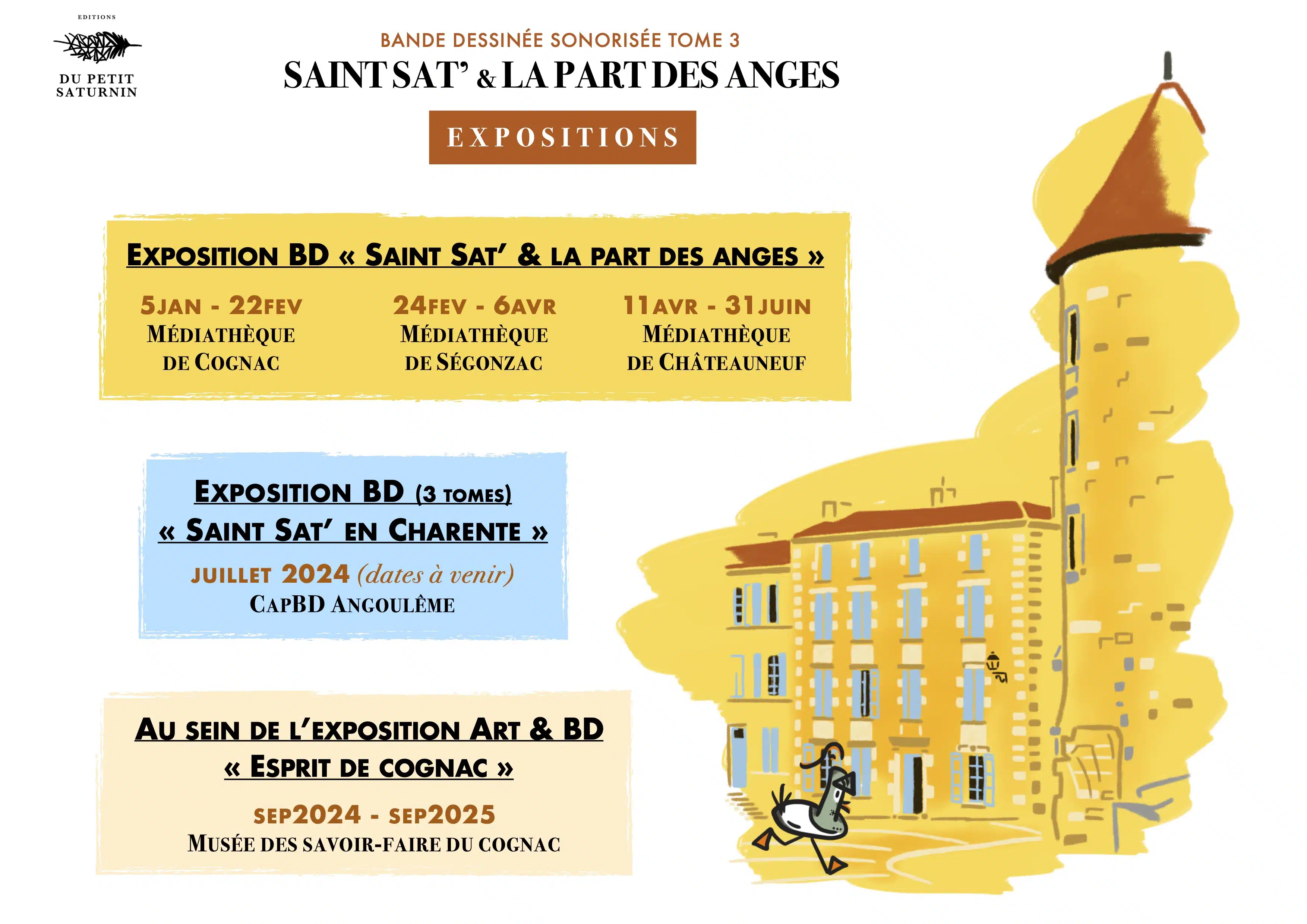 Grand Cognac affirme une politique culturelle forte et emblématique pour le territoire depuis le lancement de la marque « Les Distillateurs Culturels » créée l’été 2020, réunissant les deux musées de Cognac. C’est dans cette volonté que s’inscrivent les grandes orientations stratégiques de la politique culturelle du territoire, en diversifiant les expositions, en enrichissant les collections, en s’ouvrant à tous les publics et en mettant en lumière les artistes qui portent les couleurs du territoire. L’agglomération de Grand Cognac est fière de présenter en avant-première à Cognac, les aventures du canard Saint Sat’ en terres charentaises… la bande dessinée de l’artiste Audrey Sedano est une invitation à découvrir toute la richesse et la beauté du patrimoine culturel charentais dans un esprit ludique et innovant (bande dessinée sonorisée avec réalité virtuelle), à l’image du territoire de Grand Cognac.