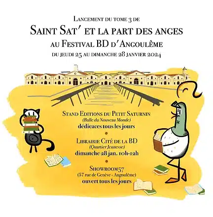 A l’occasion de la sortie du Tome 3 des aventures de Saint Sat’, retrouvez Les Editions du Petit Saturnin au Festival du 25 au 28 janvier 2024 à plusieurs endroits pour des séances de dédicaces et rencontres avec les auteurs Audrey Sedano et Johan Pelzer.