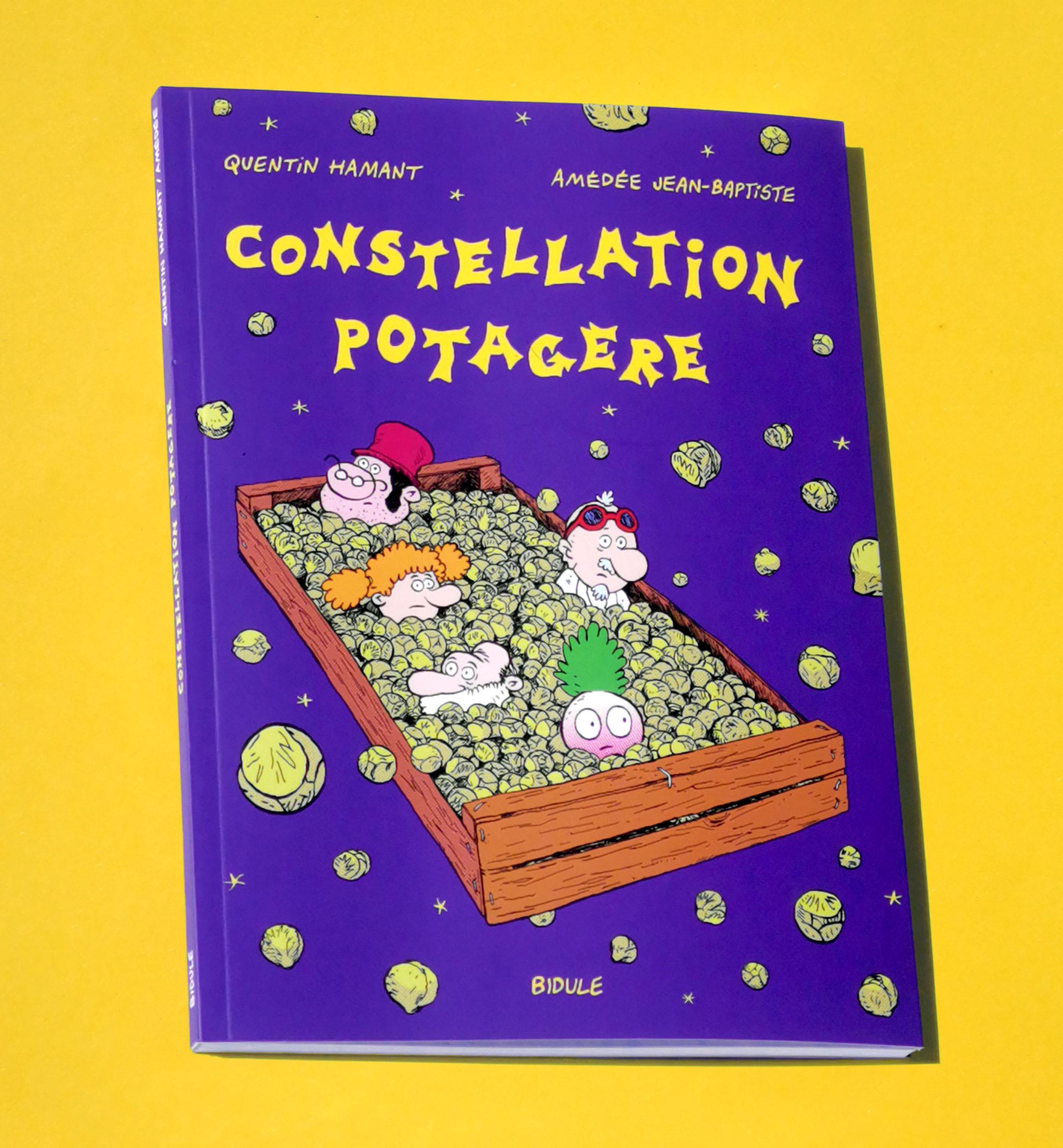 Constellation Potagère est un album de bande dessinée, réalisé à quatre mains par Amédée Jean-Baptiste et Quentin Hamant, tous deux amateurs d’histoires rocambolesques, de personnages biscornus, d’humour absurde et de jeux de mots approximatifs et fondateurs des Editions Bidule, récemment installée à Angoulême.
